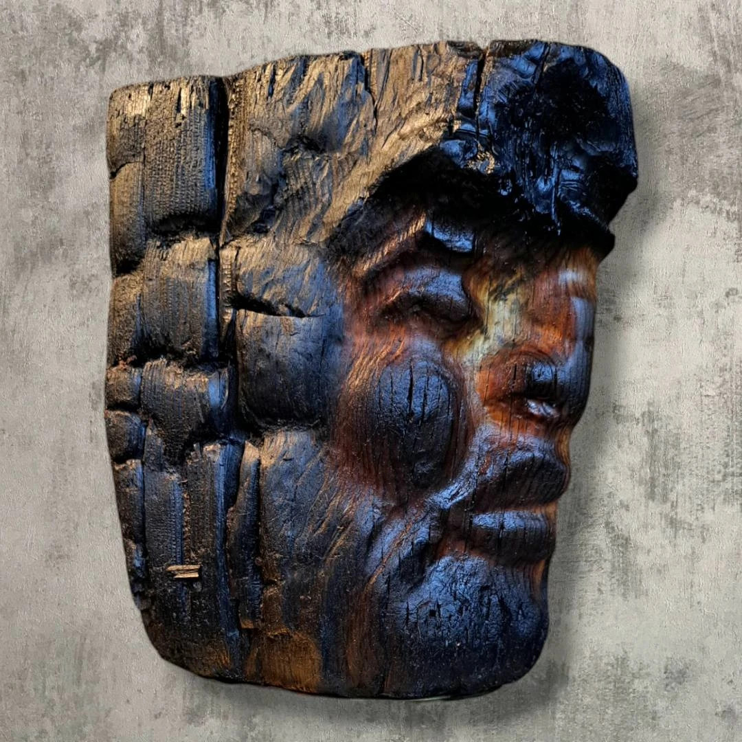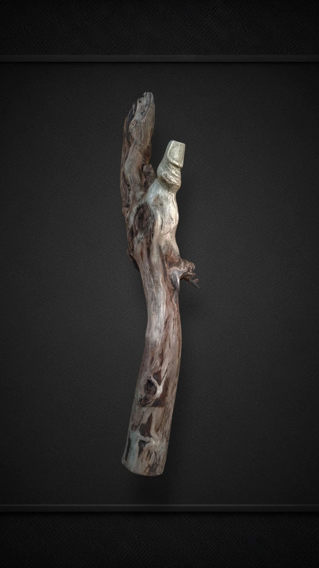 Veistos jonka materiaaleina koivupuu/ilmassa kuivuva savi.