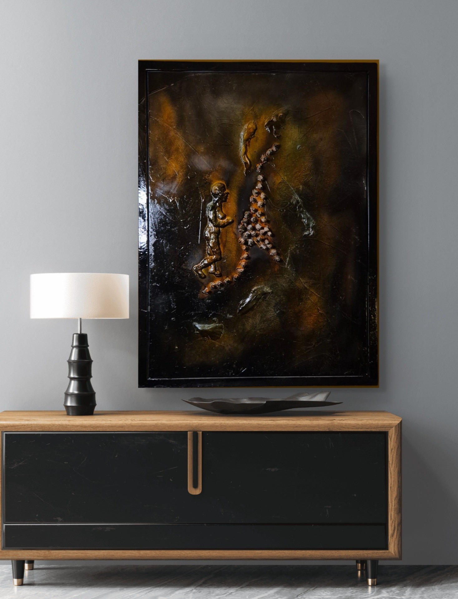 (Teos on syntynyt taiteilijan telttaretkellä. Hänen poikansa sukelsi rungon järvenpohjasta.)